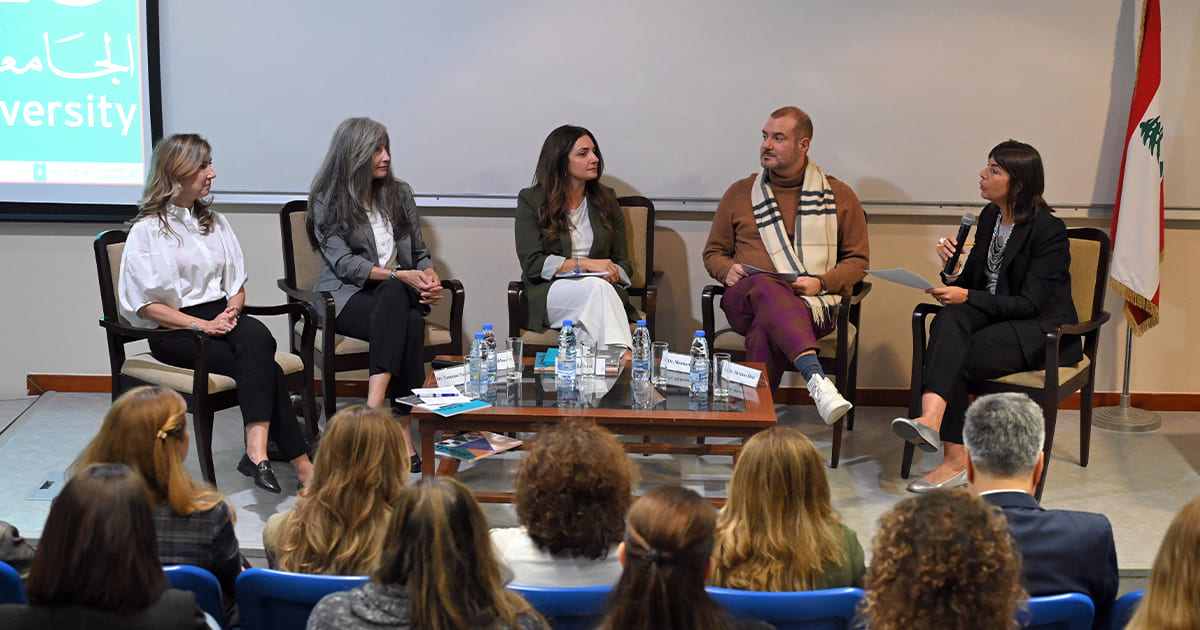 A panel discussion followed, featuring interdisciplinary scholars: Dr. Dima Dabbous, regional director of Equality Now and former AiW director; Lea Kai, project manager at UNDP and the Ministry of Environment; Dr. Yasmine Taan, assistant professor at the LAU School of Architecture and Design; and Dr. Sleiman El Hajj, associate professor of creative writing at the LAU School of Arts and Sciences.