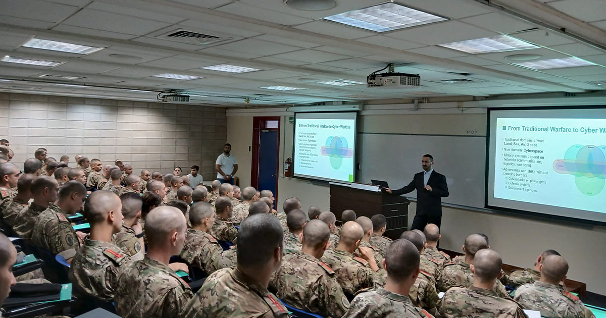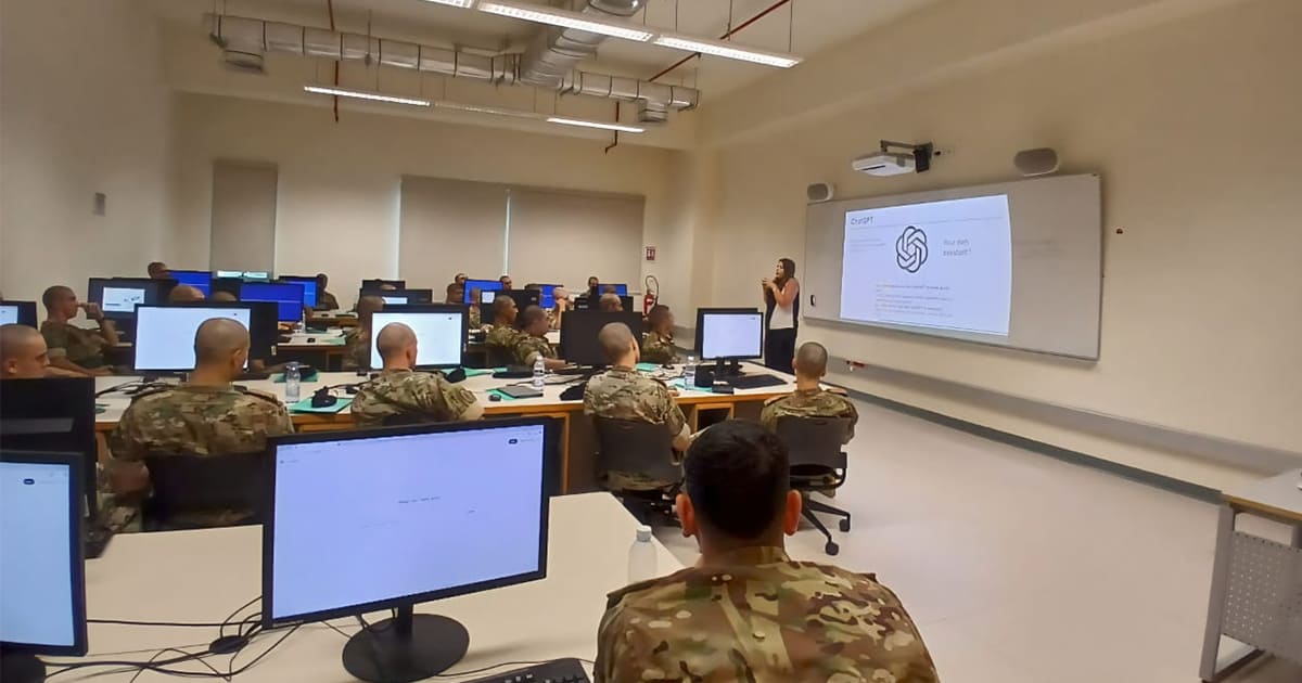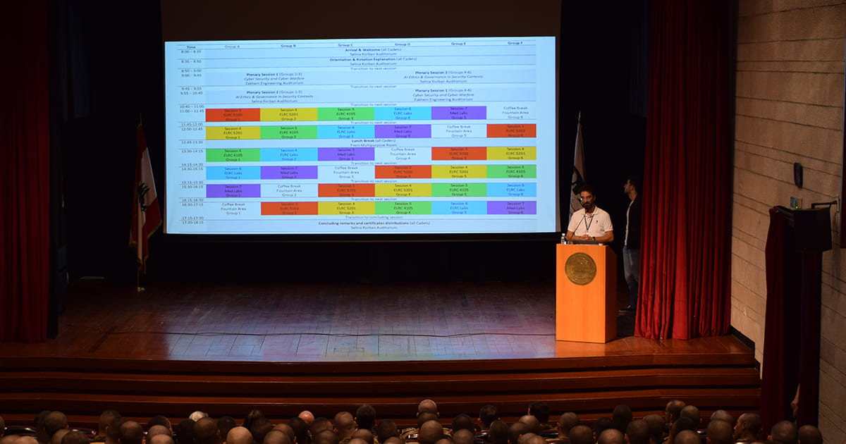 The cadets participated in seven sessions led by LAU experts. These included presentations by Assistant Professor of Computer Science Khalil Mershad on cybersecurity and cyber warfare, Associate Professor of Biochemistry Joseph Stephan on AI ethics and governance in security contexts, Assistant Professor of Management Samar Aad on prompt engineering with ChatGPT, Assistant Provost for Educational Resources and Innovation Jordan Srour on AI-powered learning tools, and Assistant Professor Charbel Tawk on AI, robotics, and the military.