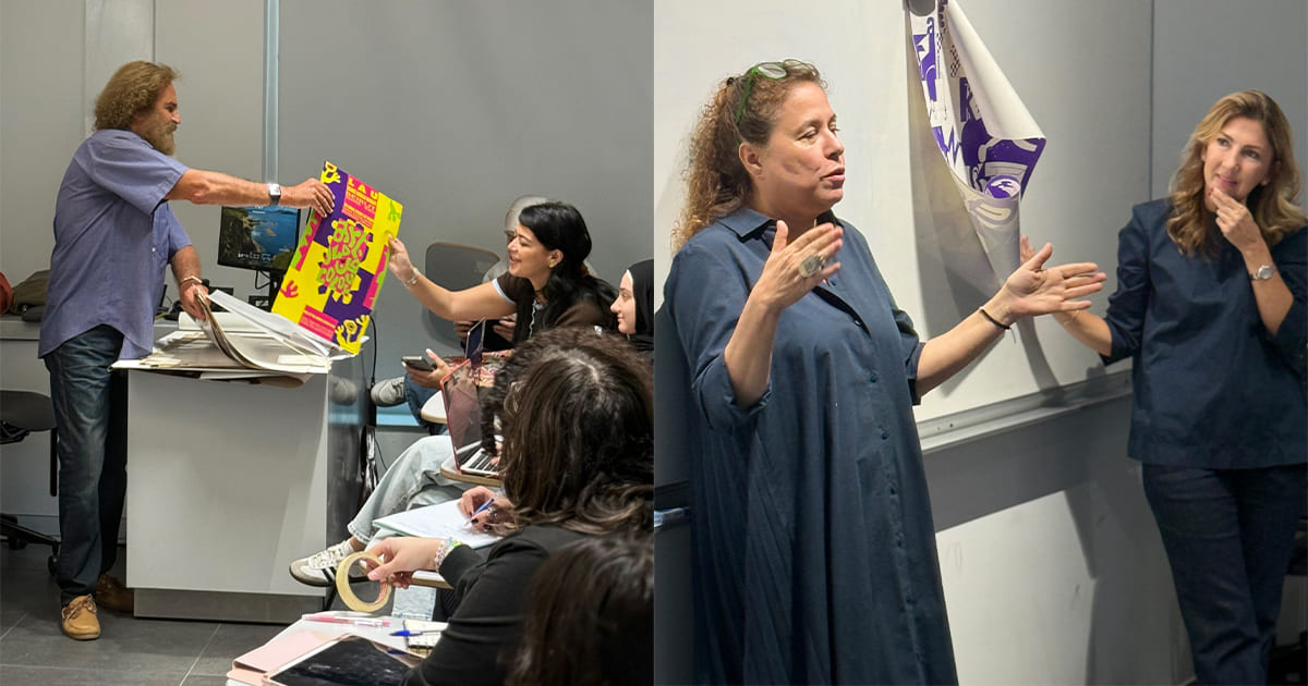 At LAU, a recent graphic design class transformed into a living archive when students came face-to-face with two generations of Lebanon’s creative industry. The session, held on November 12, brought together veteran printer Rami Al Khal and LAU alumna Bettina Mahfoud (AAS ’88; BA ’91), who shared rare insights and original posters from Beirut’s design scene of the 1970s and 1980s, included in a major collection Al Khal recently donated to LAU.